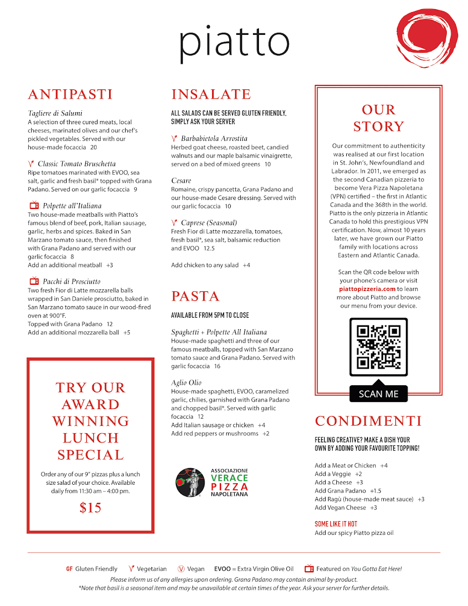 Welcome to Piatto Pizzeria Enoteca, a culinary gem nestled in St. John's, NL. This vibrant pizzeria offers a delightful range of dishes that celebrate authentic Italian flavors.